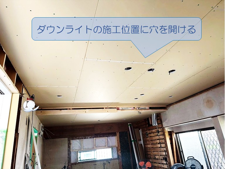ボードの施工が完了したら、あらかじめ決めておいた位置に合わせてダウンライト用の穴を開けます。