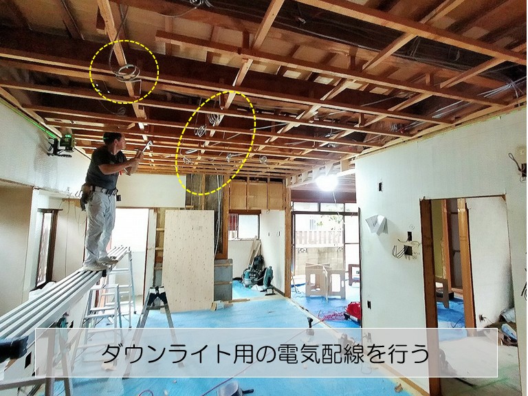 次に、天井にダウンライトを設置するための電気配線を行いました。