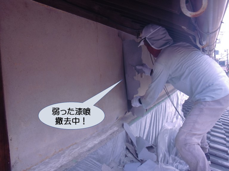 既存の漆喰はヘラでこすると簡単に剥がれるくらい傷んでいました。健全な漆喰は外壁面にしっかりと密着しているので簡単には剥がれません。