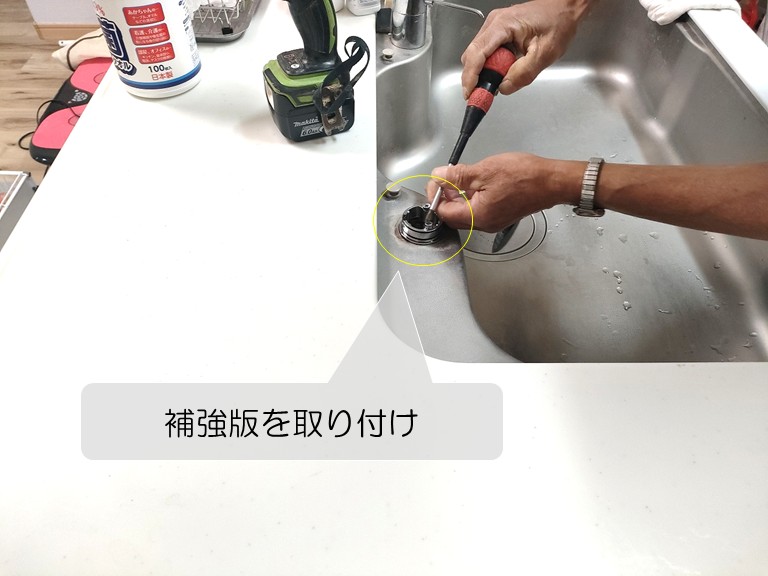 補強板は、水栓まわりの強度を高めるための部材で、長年の使用で傷んだ天板のぐらつきを防ぐ役割があります。