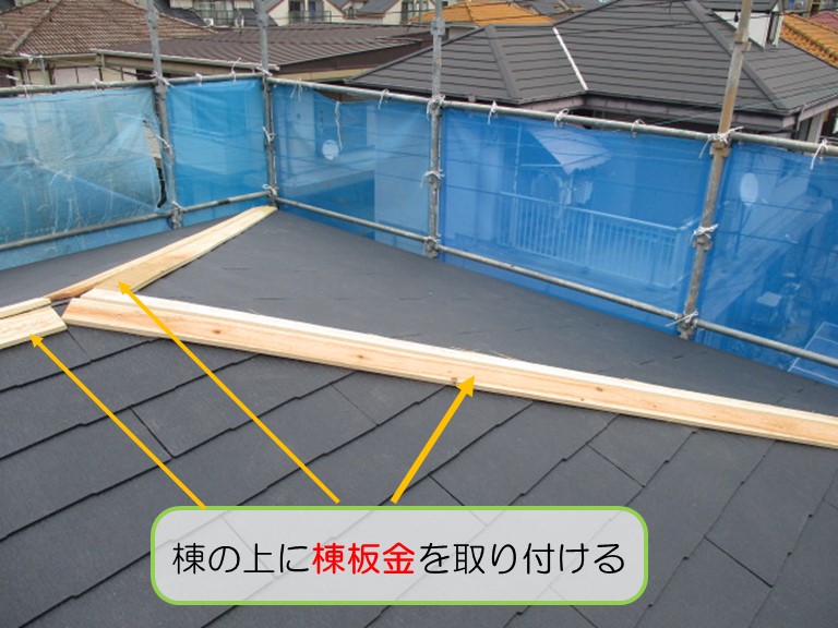 棟板金とは、屋根のてっぺんに取りつけて、雨や風を防ぐための金属のカバーのこと。