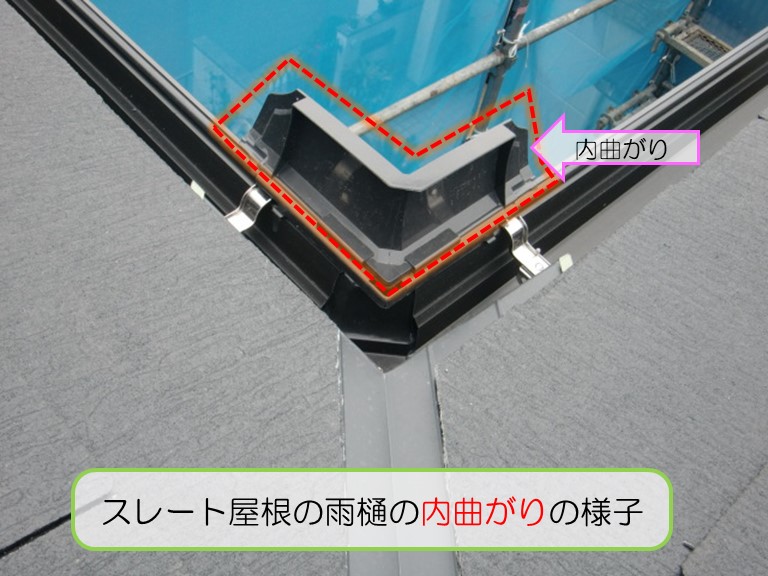 高石市S様邸のスレート屋根の雨樋の内曲がりの様子