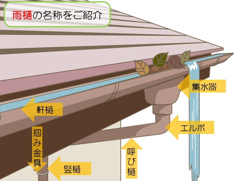 軒樋・・・屋根のふちに取り付けて、雨水を受け止める横向きの雨樋。