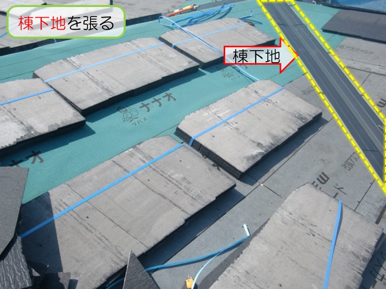 高石市のS様邸で防水シートの上に棟下地を貼る