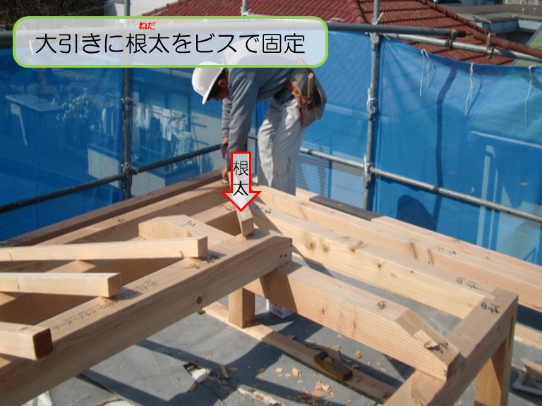 これらの部材が組み合わさることで、強固な屋根構造の基礎が完成します。