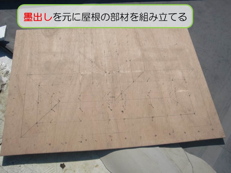 高石市S様邸の屋根の墨出しを元に部材を組み立てる