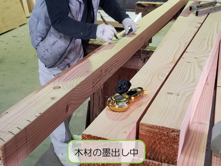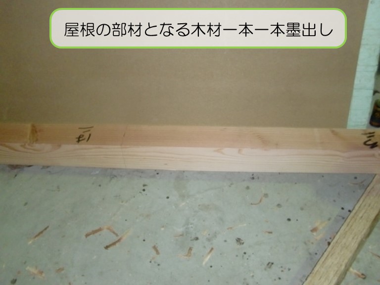 高石市の陸屋根で雨漏り解決!大工職人の1本1本丁寧な墨出し作業