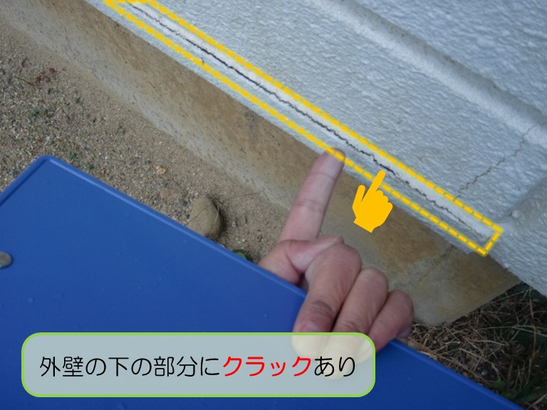 高石市S様邸の外壁の下部分にクラックが発生し、さらに外壁材の一部が欠けている状態も確認しました。