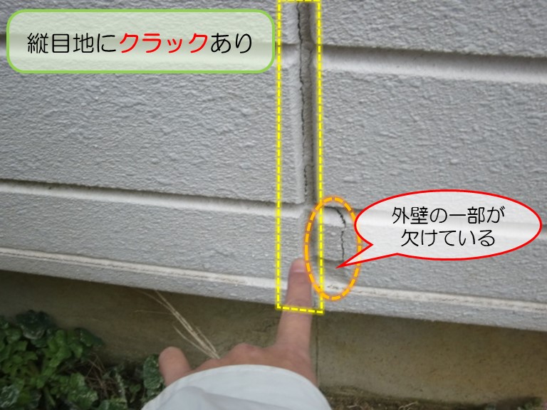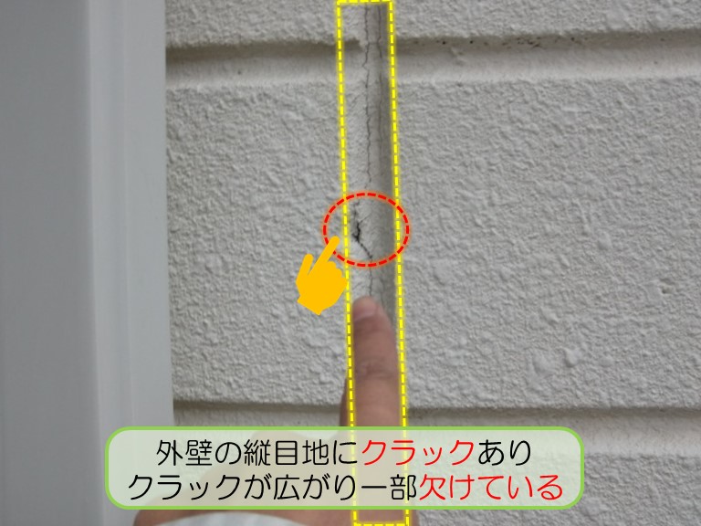 高石市S様邸の縦目地のクラックが拡大し、一部が欠けている状態でした。