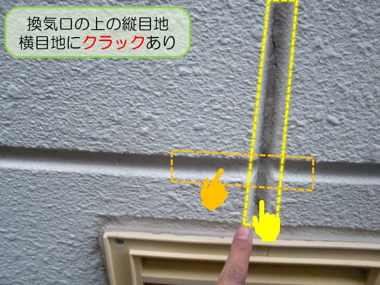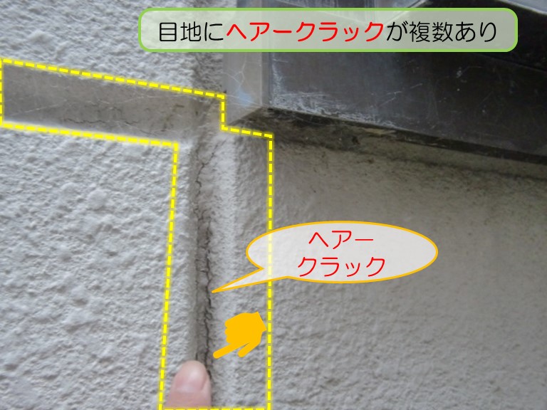 高石市S様邸の外壁の縦目地・横目地ともにクラックが発生しており、特に縦目地には髪の毛のように細いヘアークラックが数か所見られました。