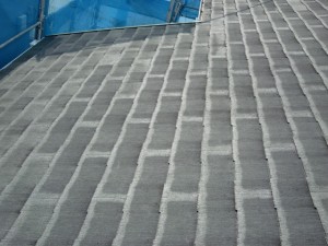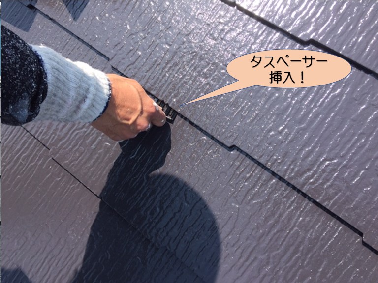 スレート屋根の塗装では、瓦の縁切りを行う必要があります。塗料を上に塗ると瓦の隙間が塗料で塞がってしまい、雨水の逃げ場が無くなってしまいます。そうなると雨漏りに発展する恐れがあるので、タスペーサーという部材を瓦の間に差し込んで、塗膜を切る作業をします。