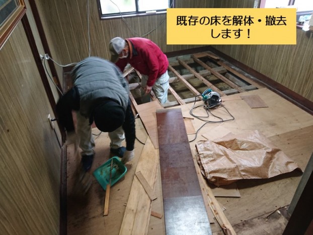 既存の床を撤去した後、床組(床を支えている構造部分)もすべて撤去していきます。