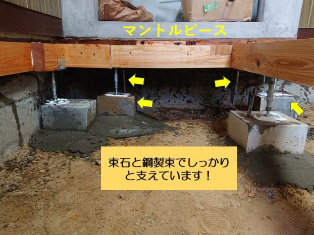 マントルピースはそのままの状態で工事を行うので、床下から床を補強して、床をしっかりと支えられるように束石と鋼製束を設置しました。