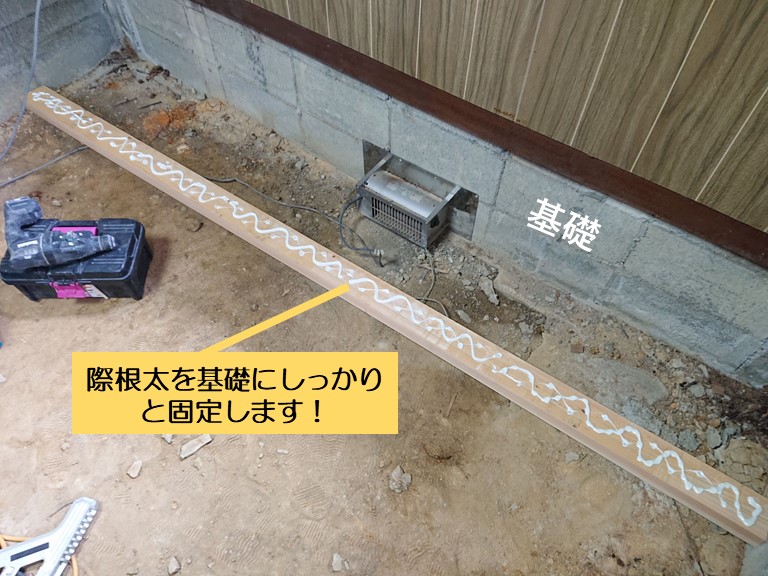 既存の際根太は束の上に載せているだけでしたが、丈夫な床組を設置するにあたり、基礎にしかりと固定することになりました。