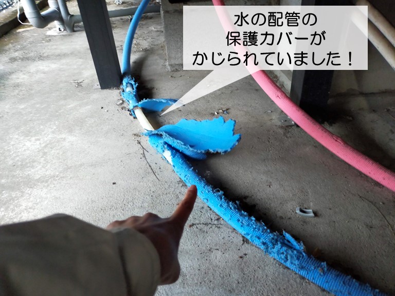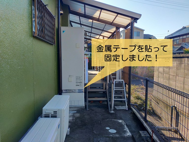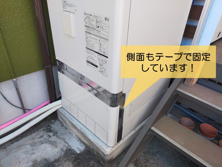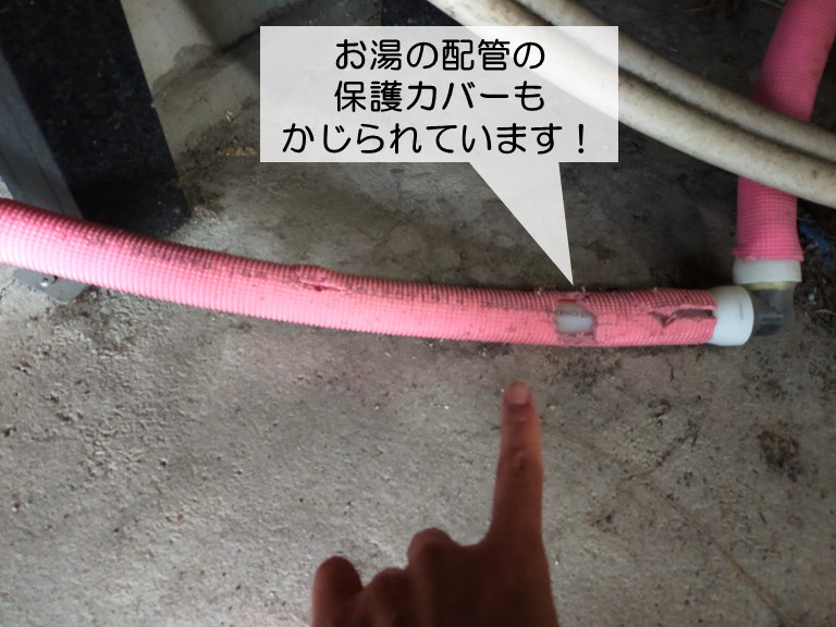 給湯機のカバーが外れてビス留めできる状態ではなかったので、金属テープを貼って固定しています。また、ユニットバスの湯水の配管を保護しているカバーが小動物にかじられていたので、保護カバーを取り付けています。
