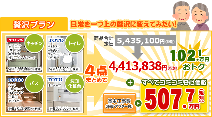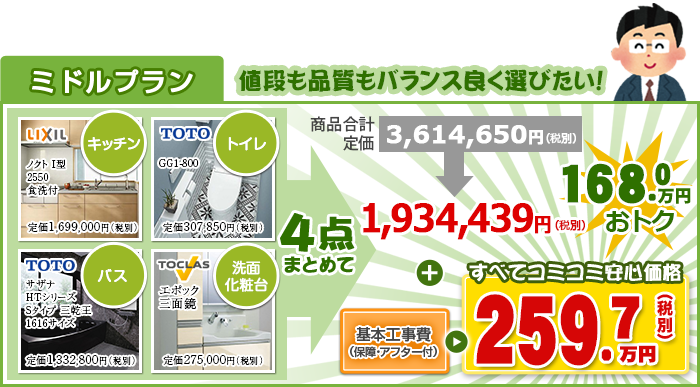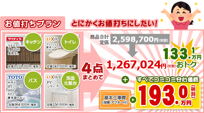 フリーダイヤルからも受付 0120-103-718※お客様へ水廻り4点セットの価格はあくまで「セット価格」での価格であり、1点のみでの販売は致しておりません。またその他のオプション品の追加、グレードの変更などについてはお気軽に担当者までお問い合わせ下さい。
