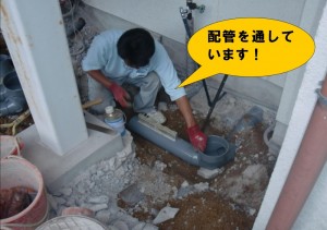 土を掘り起こした後、新しい配管を下水管まで通していきます。
