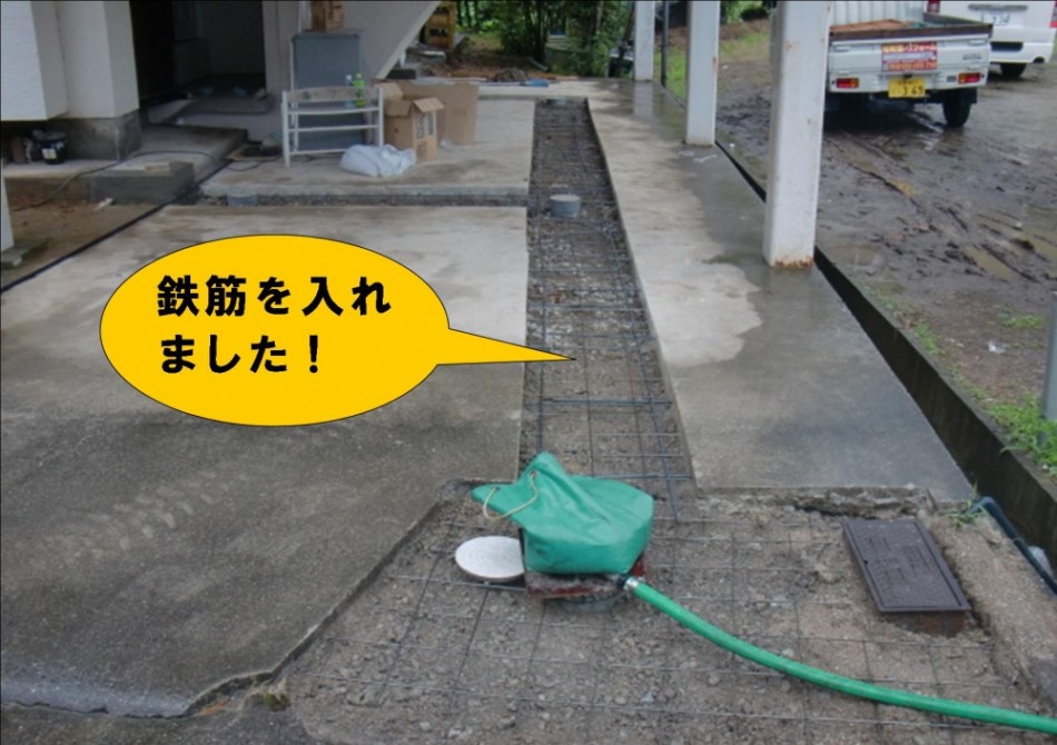 土を水締めした後、基礎の鉄筋を設置します。