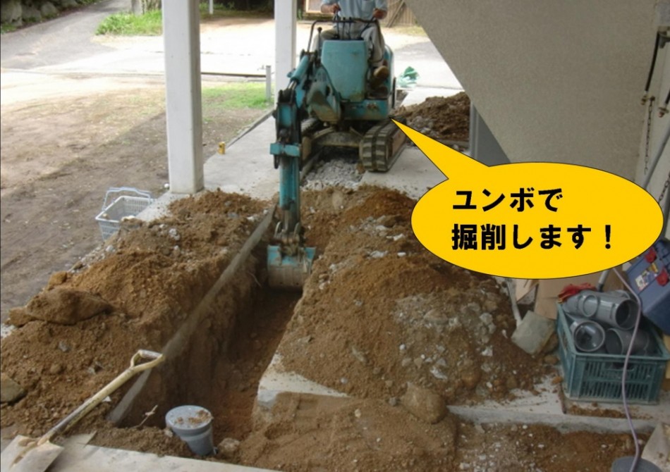 コンクリートをある程度割り終えた後、ユンボで掘削していきます。