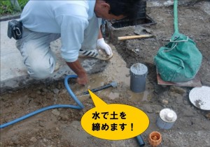 配管設置後、土を戻し埋めて、ホースを差し込んで、水を流し土を締めます。何ヵ所もホースを差し込んで行うのですが、この工程を怠ると、土間をうった後、地盤が沈んでしまうことがあります。
