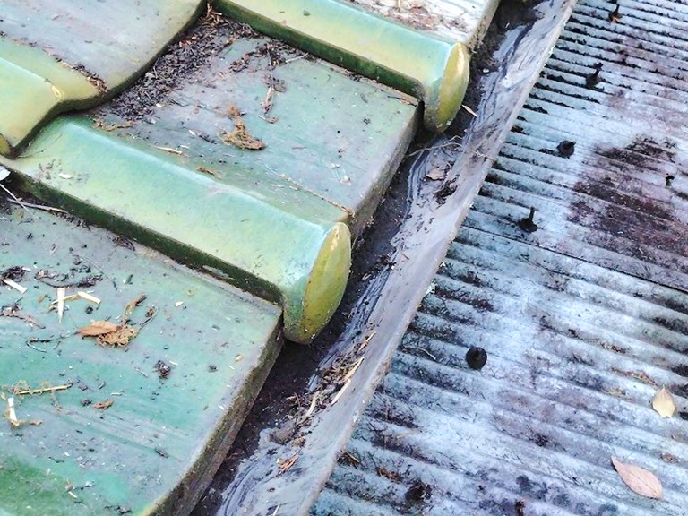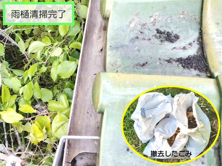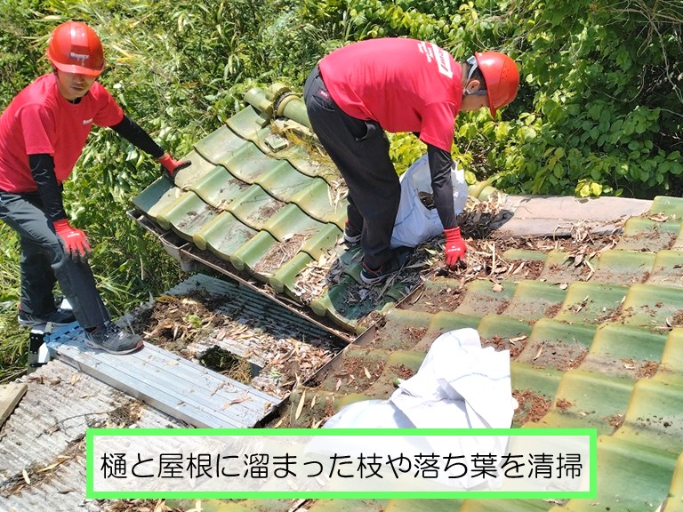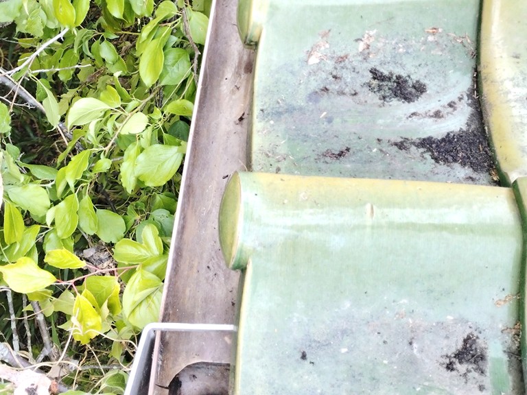 まず最初に着手したのは、雨樋および屋根面に堆積していた枝葉やゴミ類の清掃作業です。