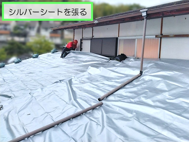 泉佐野市で屋根のブルーシートをシルバーシートに張り替えて雨樋清掃!約25万円(工期 1日)