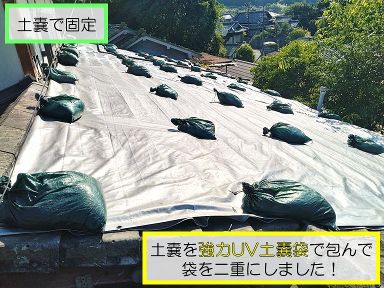 新たに張り替えたシルバーシートは、下屋全体をしっかりとカバーし、強力UV土嚢袋で二重に包んだ土嚢を等間隔に配置することで、強固に固定されています。