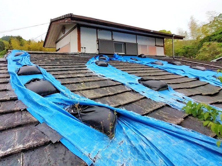 さらに、下屋部分に設置されていたブルーシートは、長期間にわたる紫外線の照射と風雨の影響により、複数箇所で激しく破れてボロボロの状態になっていました。