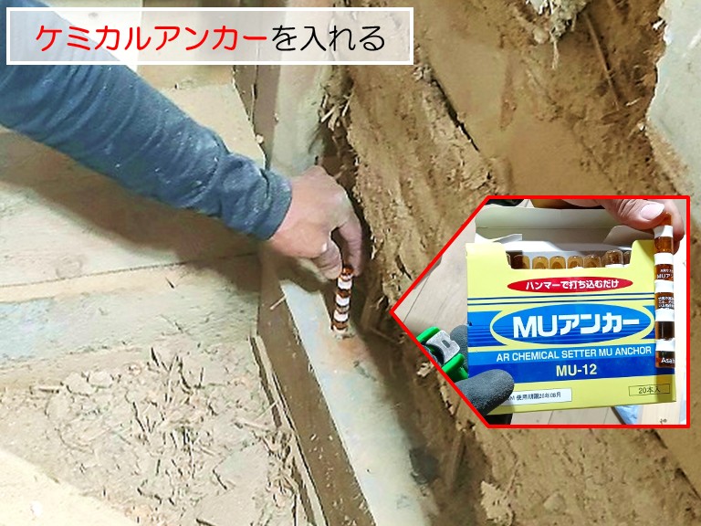 ケミカルアンカー注入後、アンカーボルトを打ち込みます。