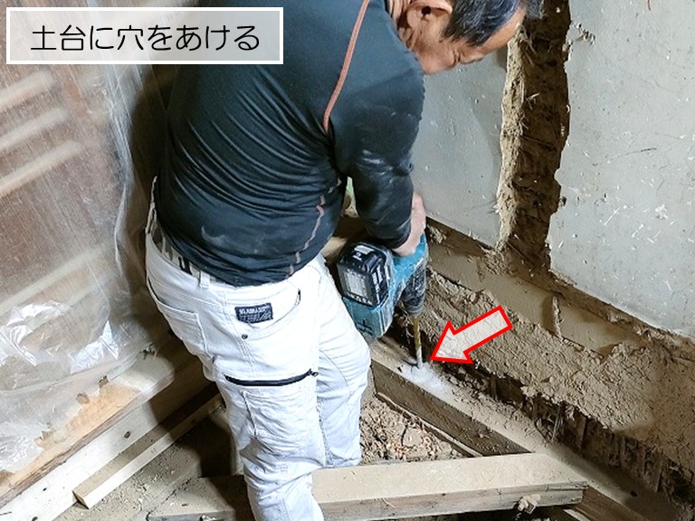 つづいて、電動ドリルで土台(木)に穴をあけます。