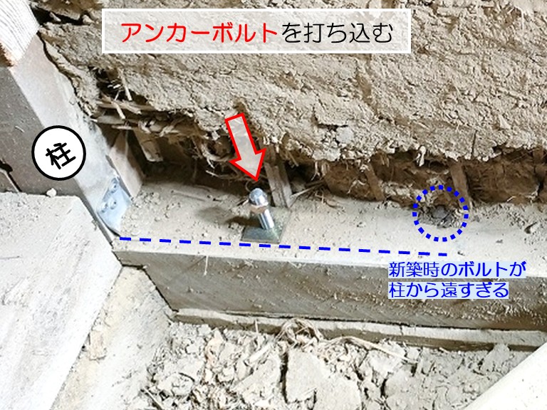 岸和田市 K様邸には新築時のボルトがありましたが、調査の結果、柱との距離が規定を外れており、十分な耐震効果が期待できない状態でした。
