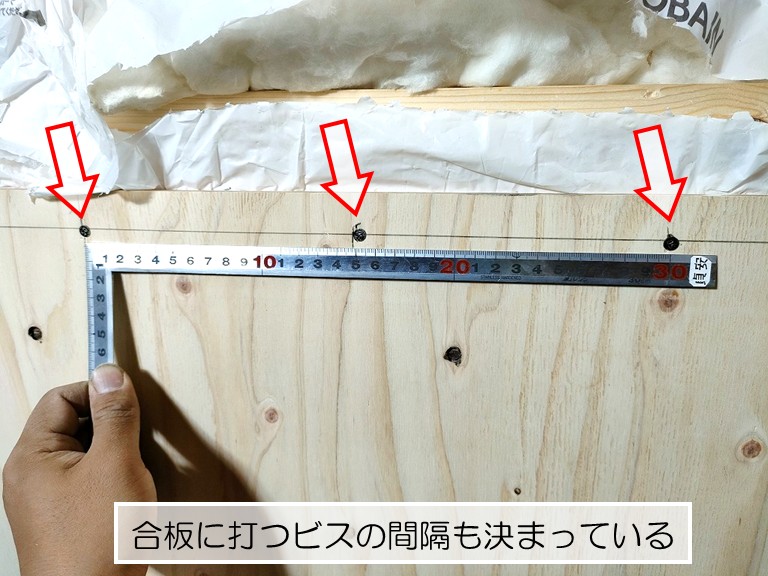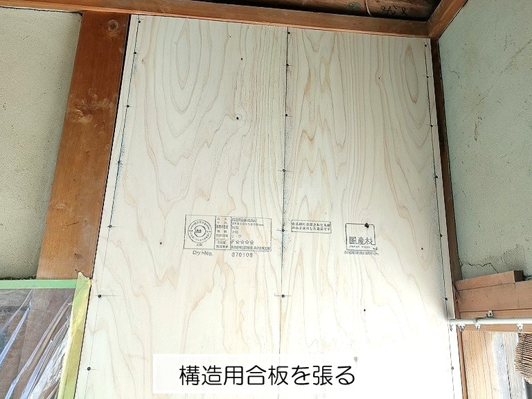 下地の完成後、JAS規格の構造用合板を取り付けます。