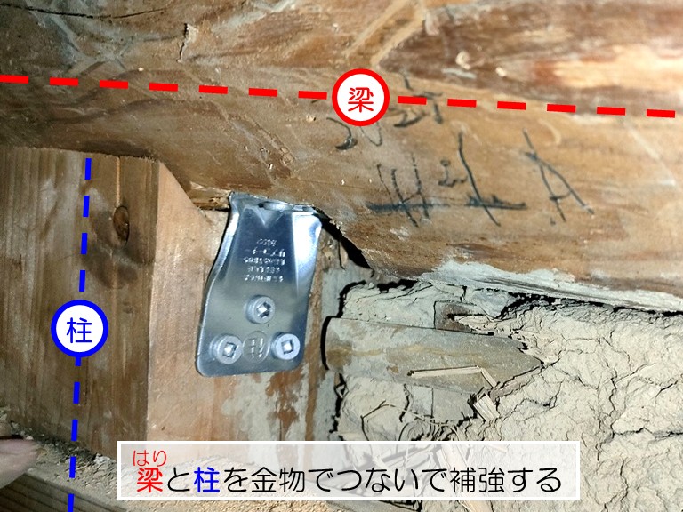 そのため、岸和田市 K様邸では屋根裏部分も施工し、梁と柱を補強耐震金物で緊結しました。