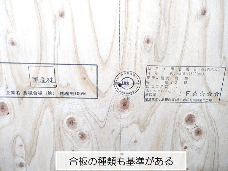 構造用合板は、一定以上の強度と耐久性を持つJAS規格品でなければなりません。