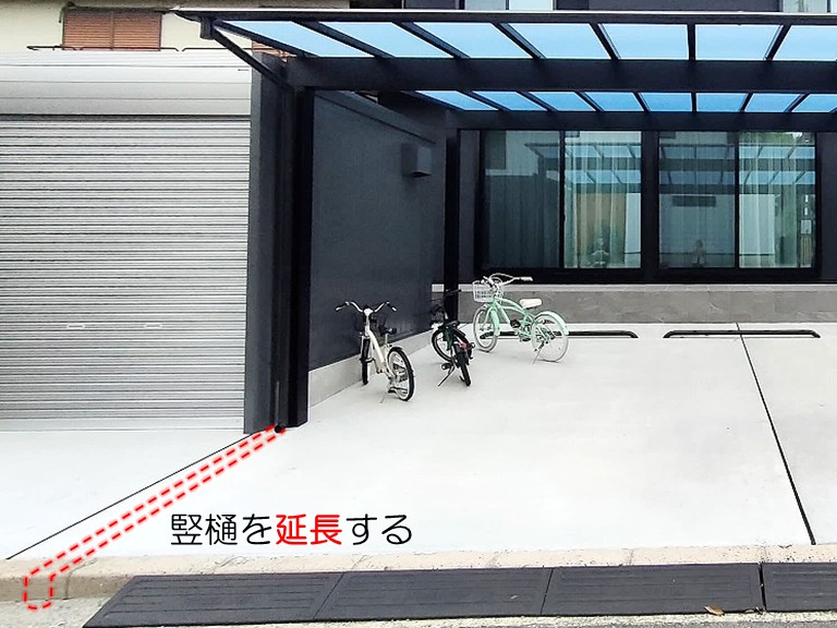 竪樋を延長したことで雨水の落ち口が変わり、駐車場の土間への雨染みや汚れを根本からシャットアウトできました✨