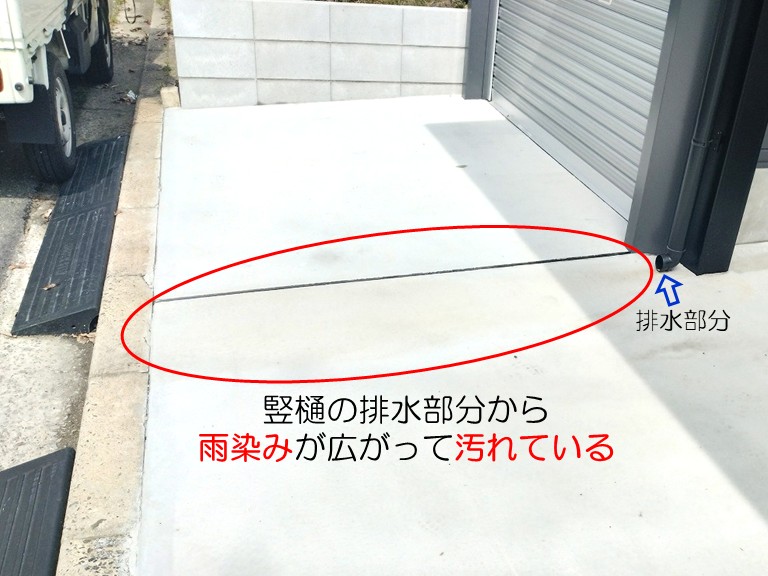 熊取町 T様邸の駐車場では、竪樋の排水部分から黒々とした