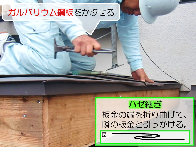 今回採用したのは「ハゼ継ぎ」と呼ばれる施工方法で、板金の端を折り曲げて隣の板金と噛み合わせるように接合する技法です。