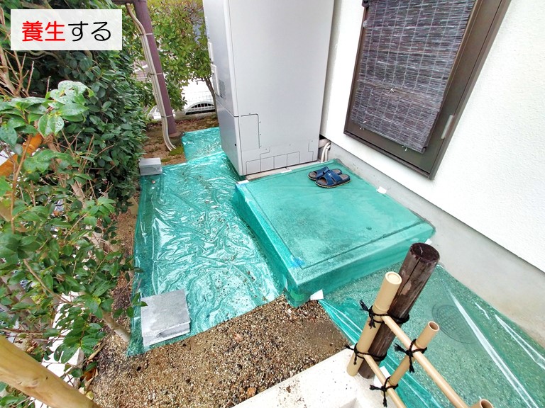 周りに洗浄水が飛び散るため、高圧洗浄前に足場にビニールを張ってから作業を行いました(^^)/