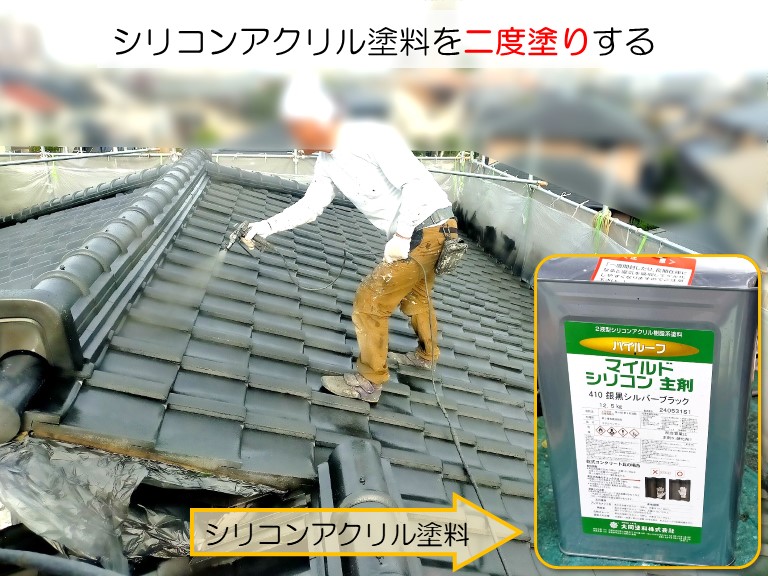 プライマーが乾燥したら、セメント瓦の屋根にシリコンアクリル塗料を二度塗りします!