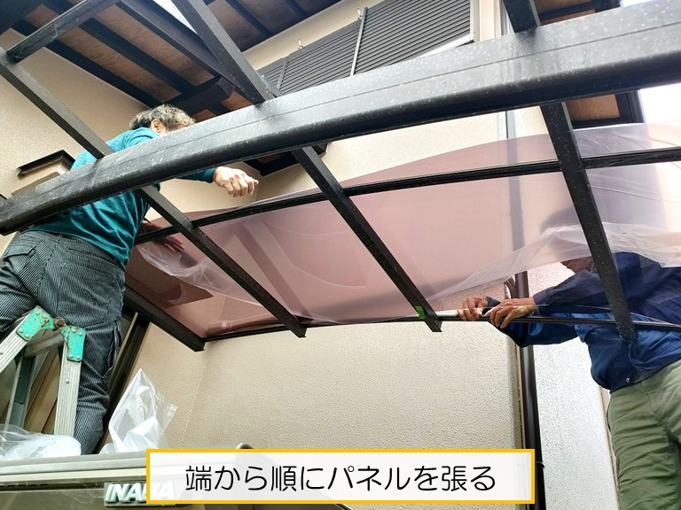 つづいて、カーポートの端から順に新しいパネルを張っていき、固定します。