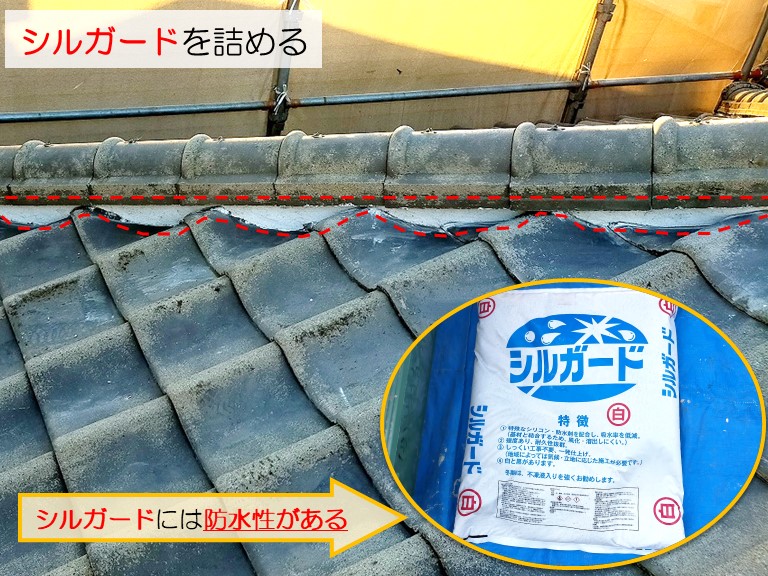 高石市 I様邸の既存の面戸には漆喰が詰められていたため同じものを詰め直しても良いのですが、漆喰には防水性が無いため雨水に触れると吸収してしまうというデメリットがあります。