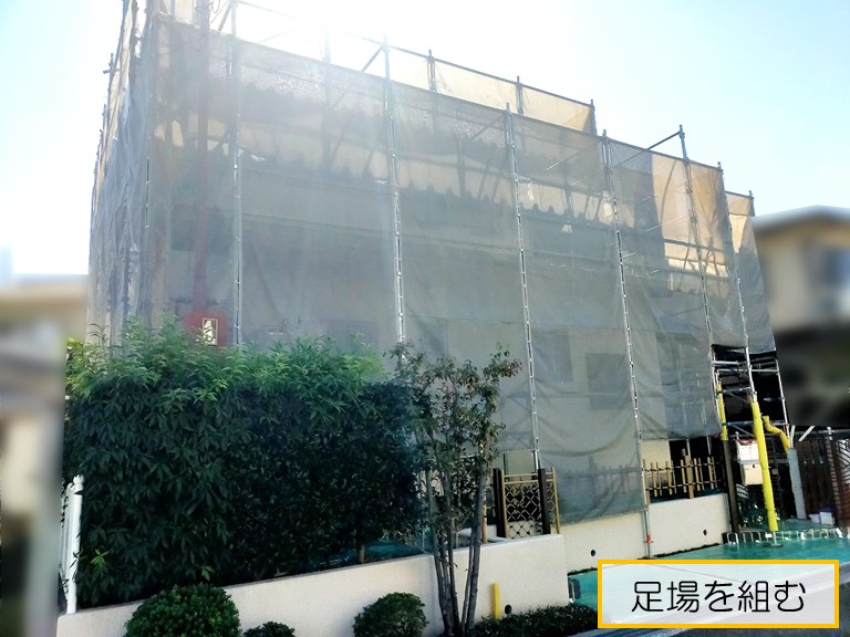 高石市 I様邸での塗装工事は足場を組んで行うのですが、カーポートとテラスのパネルが障害となって足場が建てられませんでした。
