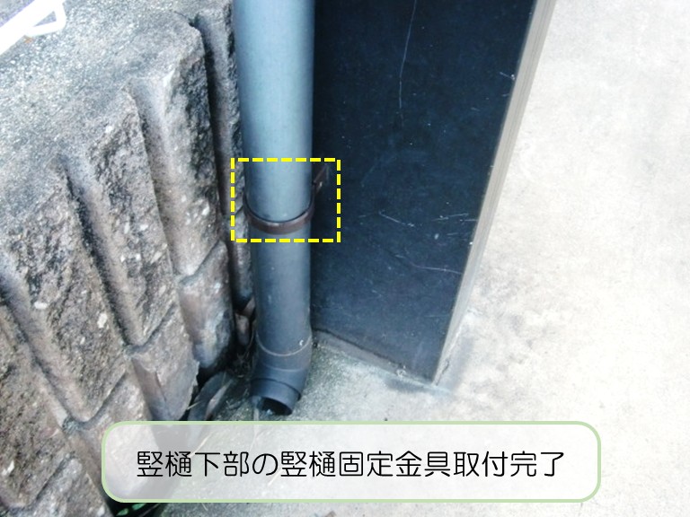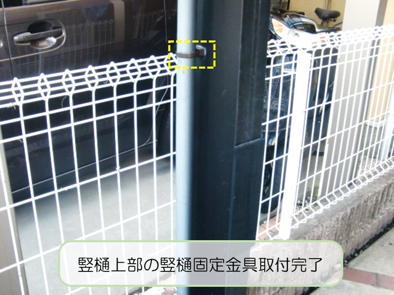 固定金具とは、この雨どいを柱や壁にしっかりと留めておくための金属の部品で、通常は上下2ヶ所以上で雨どいを支えています。