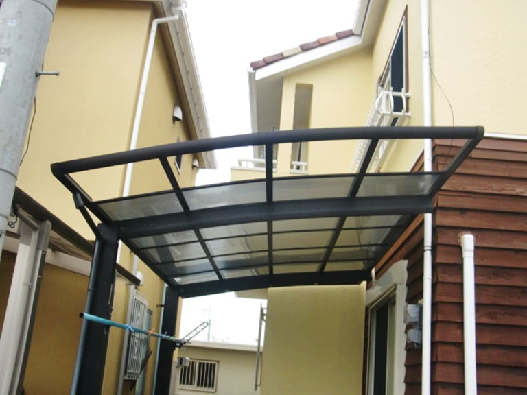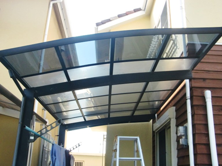 今回A様邸では、カーポート修繕とポリカ平板交換工事と、竪樋の固定金具の取付、物干し竿掛けの取付を行いました。