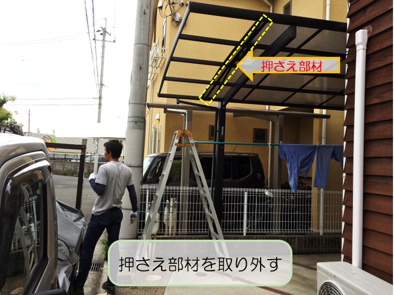 泉大津市A様邸のポリカ平板固定用の押さえ部材を取り外し