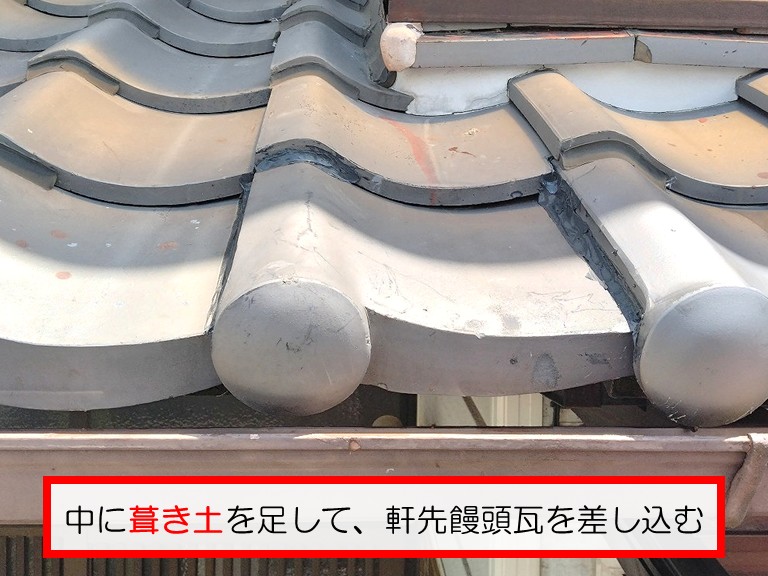 熊取町 O様邸の軒先饅頭瓦の準備ができたら、背面部分に葺き土を足して、設置高さと傾斜角度の微調整を行いながら、軒先饅頭瓦を差し込みます!