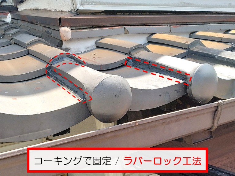 ラバーロック工法とは、瓦と瓦の接合部や隙間部分にL字にコーキング材を注入し、固定する技術です。