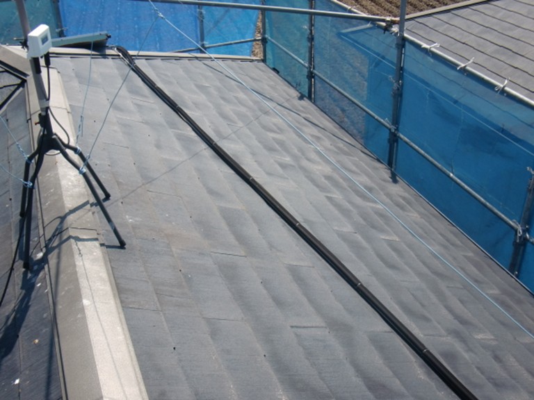 和泉市N様邸のスレート屋根材の一部に、過去にひび割れを補修した形跡が見られました。
